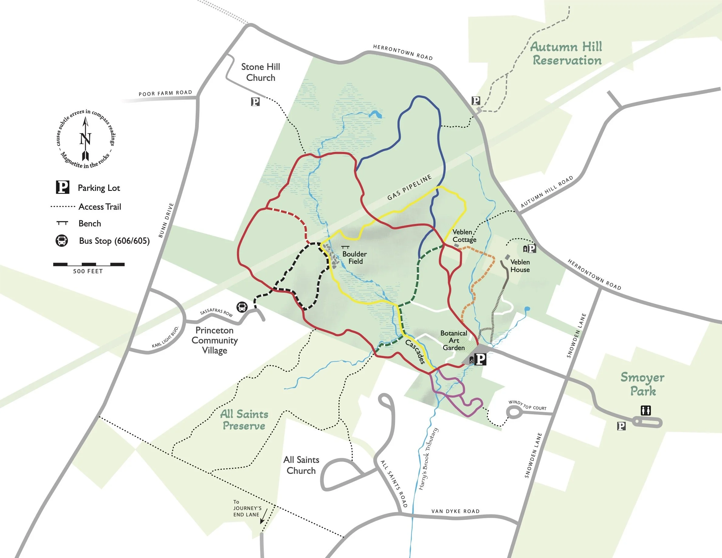 The Yellow Trail traces Harry’s Brook. The Red Trail brings you all around the woods. Take the Orange Trail to the Veblen House. Explore until you know them all.